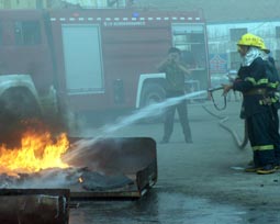 演練現(xiàn)場:消防隊(duì)員對火災(zāi)現(xiàn)場進(jìn)行撲救