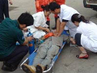 演練現(xiàn)場:醫(yī)療救援人員對中毒人員進(jìn)行搶救